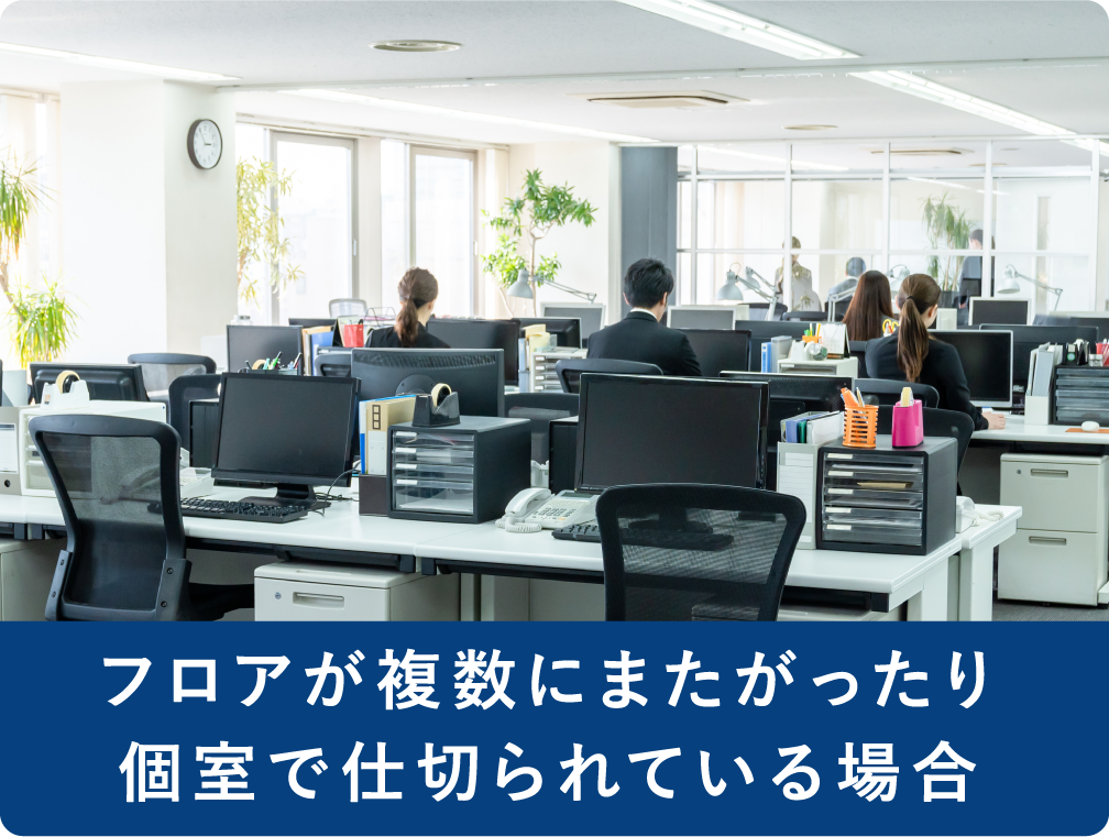 フロアが複数にまたがっているオフィスで電話の取次ぎを行う場合、一般の家庭用電話機の場合、階段を上り下りして電話をまわす必要がありますが、ビジネスフォン(ビジネスホン)であれば、「保留」して転送するだけで、電話の取次ぎが可能です。また、同フロアで個室に仕切られている場合も、同じことがいえるでしょう。また、複数の拠点を持つ場合は、それぞれのPBX同士を接続することで、拠点間をまたがって内線網を構築することも可能です。