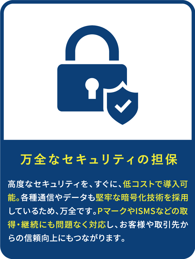 ウイルス感染や不正アクセス、情報漏えいなど様々なリスクが予測される今、 企業ではセキュリティ対策の需要が非常に高まっています。 CNCでは法人携帯以外にも、入退室管理システムやウイルス対策等のご提案が可能です。 デバイスの導入からセキュリティ対策までワンストップでお任せください。